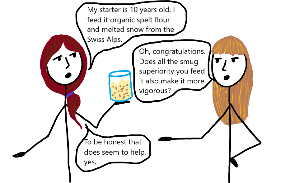 But then a few weeks ago – and maybe you folks have heard about this – a global pandemic cancelled all of humanity’s plans. In the absence of literally anything else to do, many people decided to fill their time by baking bread. Which meant that yeast – like toilet paper, face masks and jigsaw puzzles – suddenly became very hard to find. So, I finally caved to an alternative bread-leavening method that I’ve been resisting for years: sourdough starter.