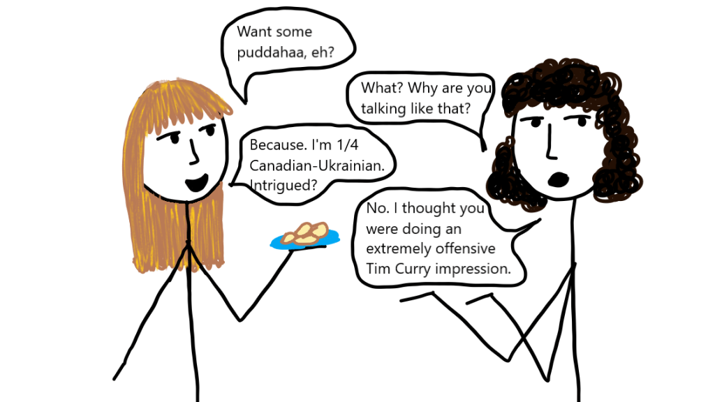 Instead of calling them “pierogies” like it said on the blue box, my mom coached me and my siblings to call them “puddahaa.” Sorry, I have no idea how to spell that because it’s a collection of sounds that doesn’t exist in the English language…or any language, as it turns out. I was told it was the Ukrainian word for “pierogi,” but I have since learned that it’s actually gibberish that emerged at the wrong end of a game of inter-generational telephone. It probably started out as something like “pyrohy.” I did not do this fact check until well into adulthood though. I proudly told all my childhood friends about the special Ukrainian name my family had for pierogies in an attempt to seem interesting.