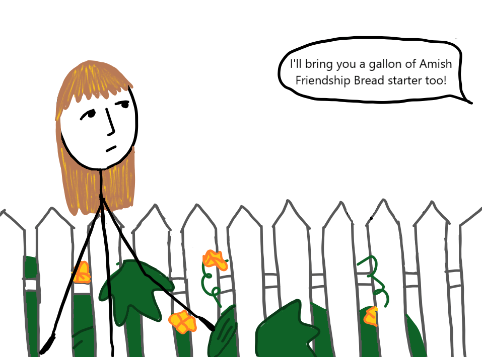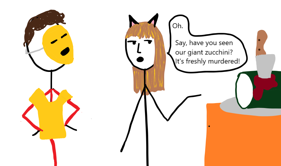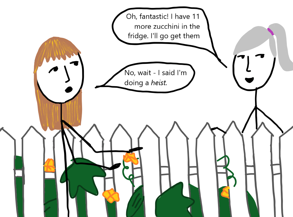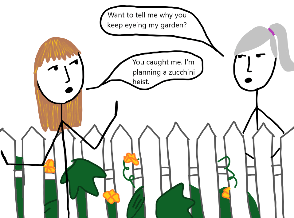 “…But say we took the dog for a walk, and we just happened to pass by the free zucchini. Then if, say, we very casually took one, it wouldn’t be weird at all.”