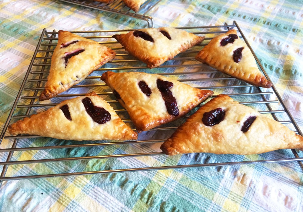 Every surface, including my face, is covered in flour. I look at the oven clock. It’s 4:00 pm, then suddenly 4:01. Only 44 minutes before I have to depart for the church picnic. I wipe my brow, smudging it with purple goo. I’m trying to seal the edges of the circular hand pie on the counter, but cream cheese filling keeps oozing out around the edges.